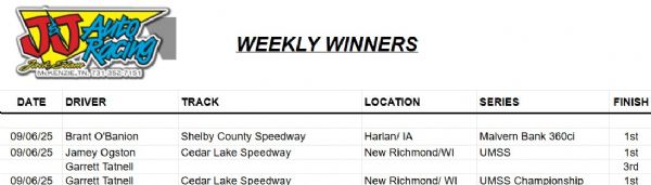 September is off to a strong start for J&J Auto Racing, with two teams celebrating victories and one securing a championship title on September 6. Brant O'Banion earned his first win at Shelby County Speedway, competing with the Malvern Bank 360ci Series. Jamey Ogston also found success, picking up a win with the Upper Midwest Sprintcar Series (UMSS) at Cedar Lake Speedway, his second victory with the team. Meanwhile, Garrett Tatnell clinched the UMSS series championship, finishing outside the top five only once during the nine-race schedule.