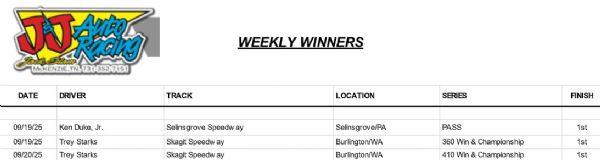 During the last weekend of summer, September 19th–20th, two J&J Auto Racing teams secured victories and clinched track championships.Ken Duke Jr. and Trey Starks each claimed victories on opposite coasts of the United States. Ken Duke Jr. added his fourth win of the season with a victory at Selinsgrove Speedway, competing with the PA Sprint Series (PASS). The Winfield, PA native collected his 27th career PASS win. Across the country at Skagit Speedway, Trey Starks swept both the 360ci and 410ci features, marking his 10th win of the season. The Puyallup, WA native also clinched both the 360ci and 410ci division Track Championships at the scenic Skagit Speedway, his fourth consecutive 410ci title.
