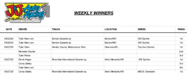 The final weekend of September has come and gone, but not without a few big wins for the J&J Auto Racing team, including a championship title. Derek Hagar and Tyler Clem both captured victories, while Corey Bailey capped off the month by securing a championship, ending September on a high note.Tyler Clem claimed victory with the Top Gun Series at Hendry County Motorsports Park, bringing his season win total to three. Currently sitting second in the Top Gun point standings, Clem will be back in action with the series on October 11, with only two races remaining in the championship chase.Marion, AR’s Derek Hagar picked up his eighth win at his hometown track, Riverside International Speedway, behind the wheel of a 305ci winged sprint car. Hagar will return to action at Riverside once again on October 10–11 with the United Sprint Car Series (USCS). Corey Bailey was crowned the Midsouth 305 Sprint Car Association Champion following the conclusion of the Grassroots Nationals at Riverside Int'l Speedway.Tyler Newcom added two victories to his season, scoring wins at Benton Speedway back on August 23 and September 20.