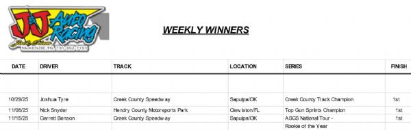What a weekend for J&J Auto Racing! Two drivers were crowned champions, and another earned Rookie of the Year honors. Joshua Tyre and Nick Snyder both captured championships, while Garrett Benson claimed the Rookie of the Year title. Kiefer, Oklahoma’s Joshua Tyre captured the Creek County Speedway Track Championship on Saturday, October 29th, in Sapulpa, Oklahoma. Joshua held a lead of more than 400 points in the final standings over second place, which was impressively secured by his wife, Kimberly. Nick Snyder, from Naples, Florida, officially collected the Top Gun Sprint Series Driver's Championship on November 8th at Hendry County Motorsports Park. The title marks a major milestone in Snyder’s racing career, showcasing his consistency and speed throughout his entire race season. Fifteen-year-old Garrett Benson from Concordia, Missouri, picked up the American Sprint Car Series (ASCS) National Rookie of the Year honors following the conclusion of the ASCS season finale at Creek County Speedway. It was a stunning accomplishment for Garrett, as this was his first racing campaign with the series. From all of us at J&J Auto Racing, we can’t thank our teams and drivers enough for their support and trust in our products. We appreciate each and every one of you and are proud to be part of your racing success.